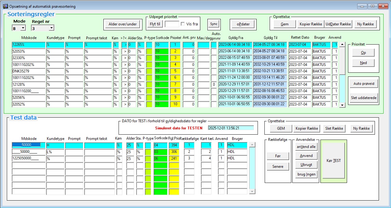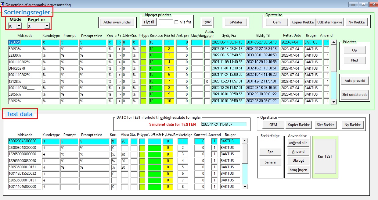 Overordnet er sorteringsregler opbygget i en sektion med sorteringsregler (øverste del), herunder en mulighed for at vælge forskellige sæt af regler (Modes og regl nr), og en sektion med test af regler (nederste del).