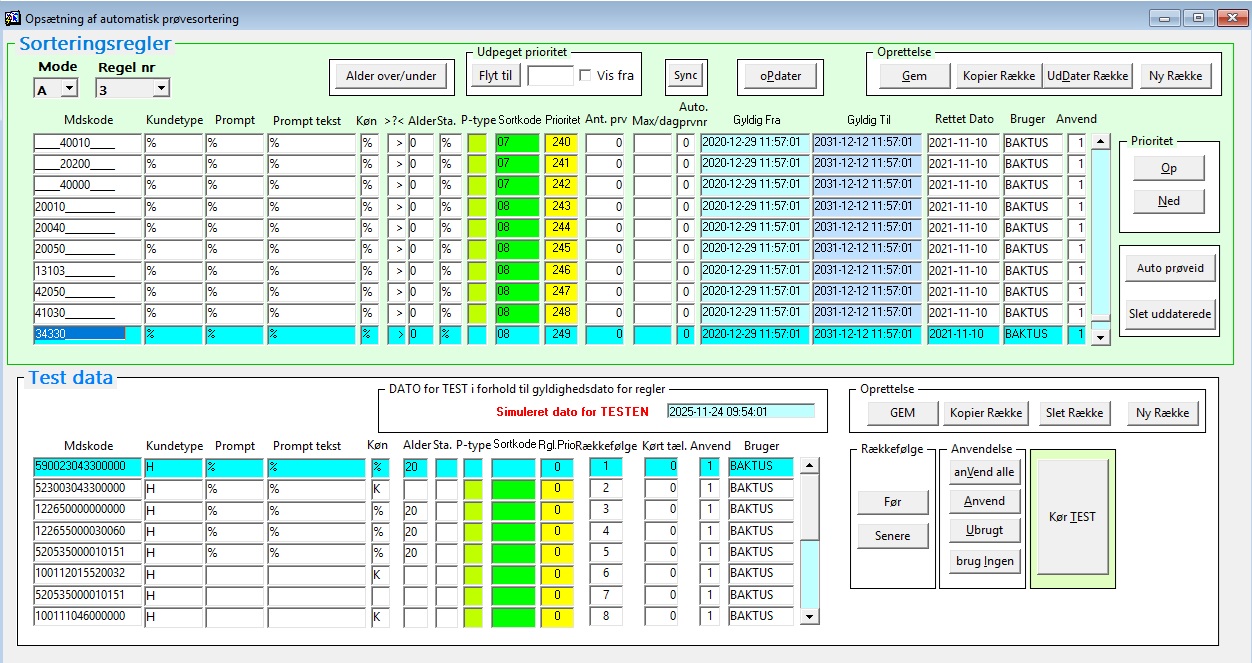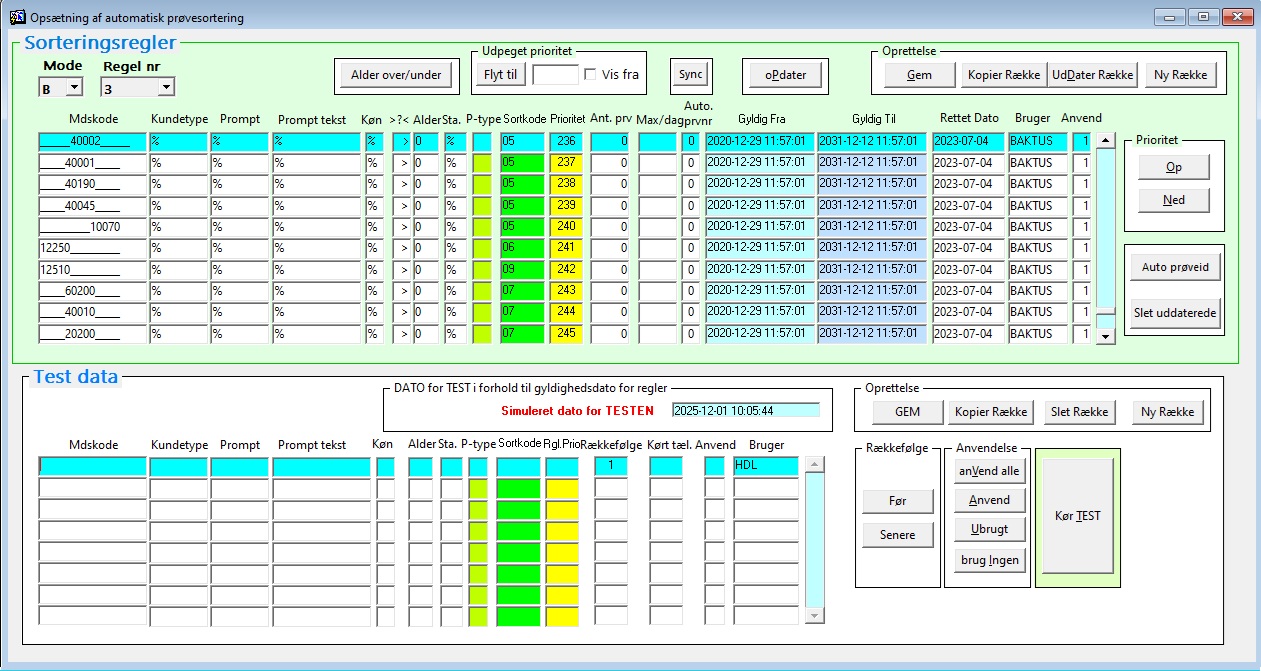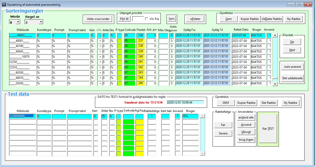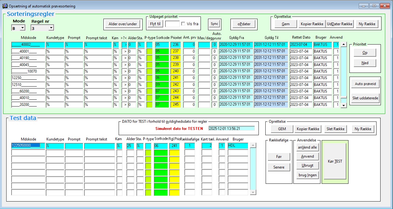 Klik på knappen ”Kør TEST”. Testen vil køres mod regelsættet (i eksemplet B 3) angivet i øverste del af billedet. Testresultatet viser hvilken skuffe prøven ville ende i og hvilken række (prioritet), der udløser testen. I eksemplet vil vi forvente, at test-kriteriet, CT+GK på podning (MDS-koden 1225050000_____) for patient med alder 25, vil sende prøven i skuffe 06 udløst af rækken med prioritet 241: