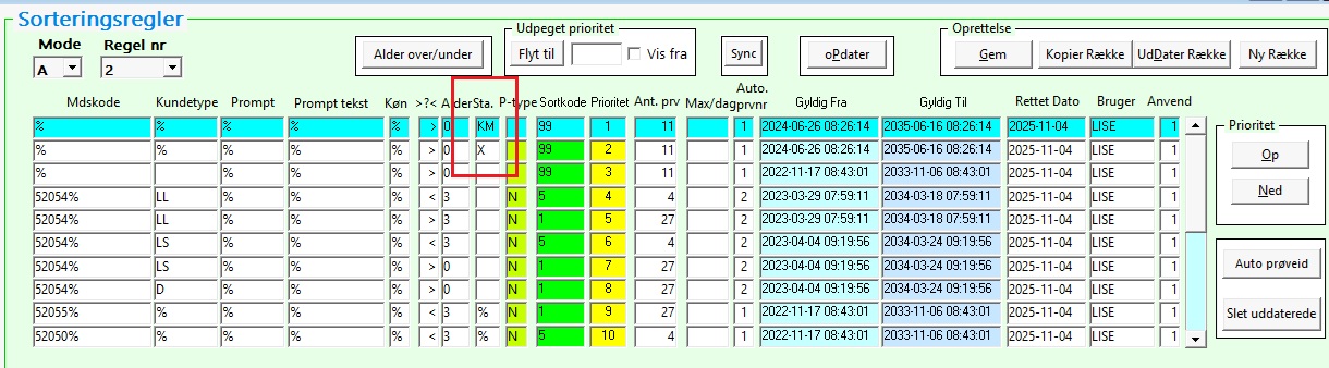 Opret: For at indsætte en ny regel, skal du klikke på knappen ”Ny Række”. Den oprettede række vil stå øverst som den første regel (højeste prioritet) indtil den er rettet til i prioritet (vent med det til det øvrige er udfyldt). En ny række kan også indsættes ved at kopiere en række via knappen ”Kopier Række”.
